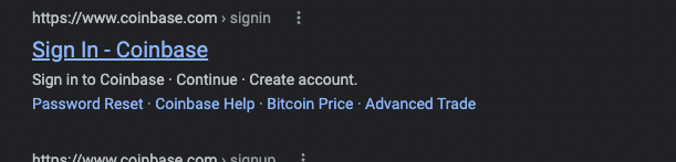 - When you click on a search result, does the website look different than the last time you logged in to Coinbase? If so, this could be a phishing page which is using an older version of our website theme.