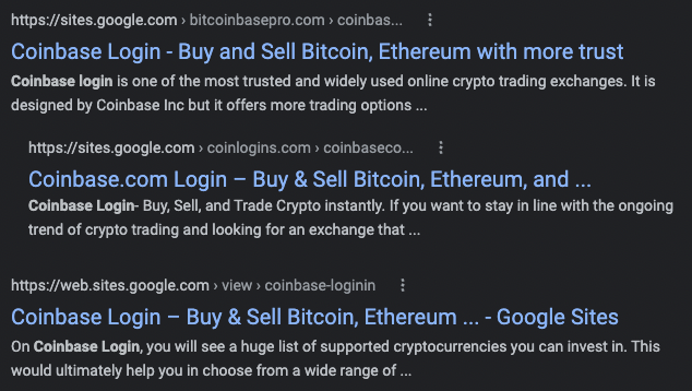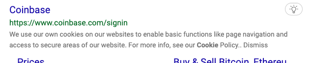 - Does the naming convention of the search result follow this pattern: [page].coinbase.com? If not, it is likely a phishing page.